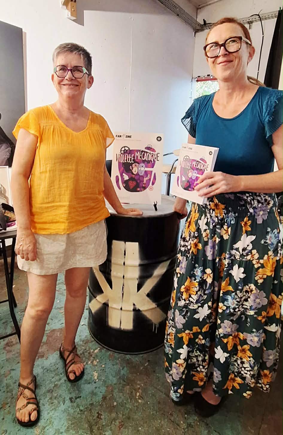Frédérique Guilaumat, autrice et Julie Legrand, éditrice lors du lancement de Violette Mécanique – FanMzine #3 – Dinguerie(s) chez KolKol, tiers lieu culturel au Tampon. Photo : Mélissa Cardarsi.